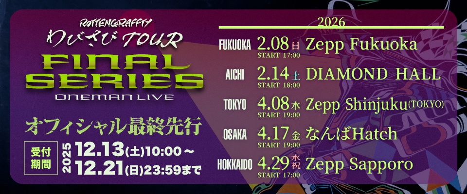- 「わびさびTOUR FINAL SERIES ONEMAN LIVE」オフィシャル最終先行受付開始!