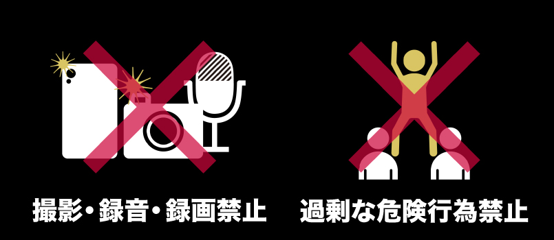 - 会場において、係員の指示に従わない方、また他のお客様にご迷惑となる行為を行う方は強制的に退場して頂く場合もございます。またその場合チケット代金の払い戻しは致しません。