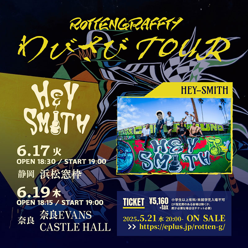 LIVE 2025/06/17(火) Thank you SOLD OUT!! わびさびTOUR @ 静岡県 浜松窓枠 HEY-SMITH Share! 2025/6/17(火)OPEN 18:30 / START 19:00 ■ チケットチケット情報/注意事項はこちら ■ お問い合わせSUNDAYFOLK PROMOTION SHIZUOKA < 戻る