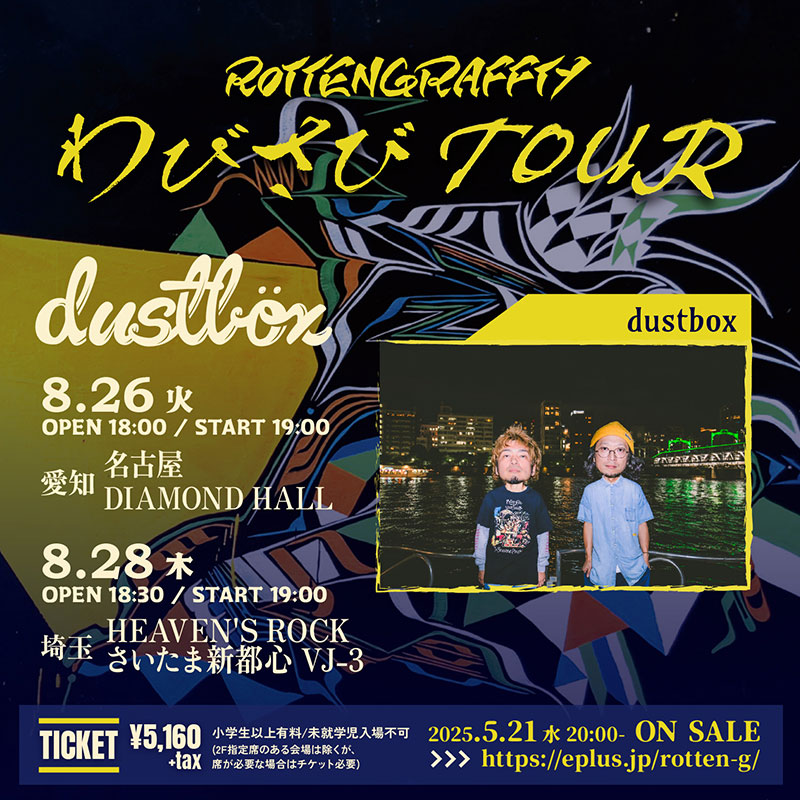 LIVE 2025/08/28(木) Thank you SOLD OUT!! わびさびTOUR @ 埼玉県 HEAVEN'S ROCKさいたま新都心 VJ-3 dustbox Share! 2025/8/28(木)OPEN 18:30 / START 19:00 ■ チケットチケット情報/注意事項はこちら ■ お問い合わせDISK GARAGE < 戻る